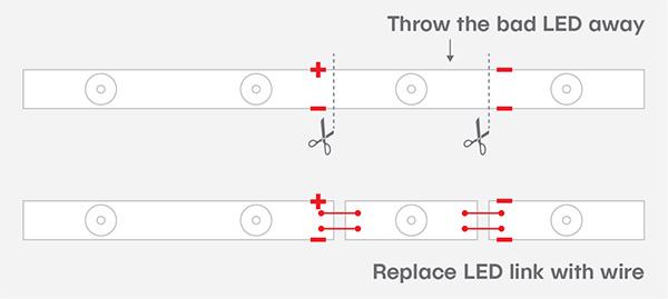 STEP 1: Find the bad LED in the strip. Cut the strip on either side of the bad lens, and remove it.